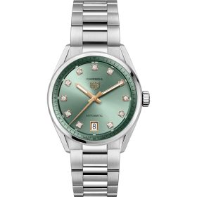 Die TAG Heuer Carrera Date kommt in einem 36-mm-Edelstahlgehäuse und besticht mit einem Zifferblatt in Sonnenschliff-Grün. Diese Uhr verkörpert moderne Eleganz neu. Das sanfte Pastellgrün des Zifferblatts wird von 11 VS-Diamanten mit insgesamt 0,22 Karat geschmückt, die für ein dezentes Funkeln sorgen. Rosévergoldete Details verleihen dem Design eine besonders edle Note.Produktspezifikationen