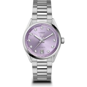 Mit ihrem zarten fliederfarbenen Zifferblatt setzt die 36 mm große TAG Heuer Carrera Date einen frischen, femininen Akzent. Diamantbesetzte Indizes verleihen dem eleganten Design zusätzlichen Glanz, während das präzise Calibre 7 im Inneren für zuverlässige Leistung sorgt. Ein stilvoller Begleiter mit Charakter.Produktspezifikationen