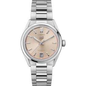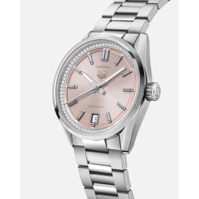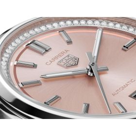 Das puderrosafarbene Zifferblatt der 36 mm großen TAG Heuer Carrera wird von einem beeindruckenden Zifferblattring mit schimmernden Diamanten (0,288 ct.) umrahmt. Diese Uhr verkörpert auf einzigartige Weise die Vision von klassischer, urbaner Eleganz. Ein charakteristisches Modell, das für einen ehrgeizigen und engagierten Lebensstil geschaffen wurde.Produktspezifikationen