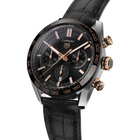 Der Carrera Sport Heuer 02 Automatic Chronograph hat ein 44-mm-Gehäuse aus poliertem, fein gebürstetem Edelstahl und birgt das Automatikwerk Heuer 02. Zu den raffinierten Merkmalen gehören Drücker und Krone mit Roségoldbeschichtung sowie ein Armband aus schwarzem Alligatorleder. Gangreserve 80 Stunden. Wasserdichte bis 100 Meter. Faltschließe mit Sicherheitsdrückern.Produktspezifikationen