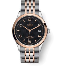TUDOR 1926 mit schwarzem Zifferblatt - Edelstahlgehäuse von 36 mm, roségoldene Lünette. Mechanisches Uhrwerk mit Selbstaufzug, Kaliber T201, Gangreserve 38 Stunden. Glatte, polierte Lünette in Roségold. Zifferblatt schwarz, dekorative Prägungen, gewölbt, goldene Indizes und Zeiger. Armband in Edelstahl und Roségold, 7 Reihen, satinierte äußere Elemente, polierte Mittelelemente, mit Sicherheitsfaltschließe.Produktspezifikationen