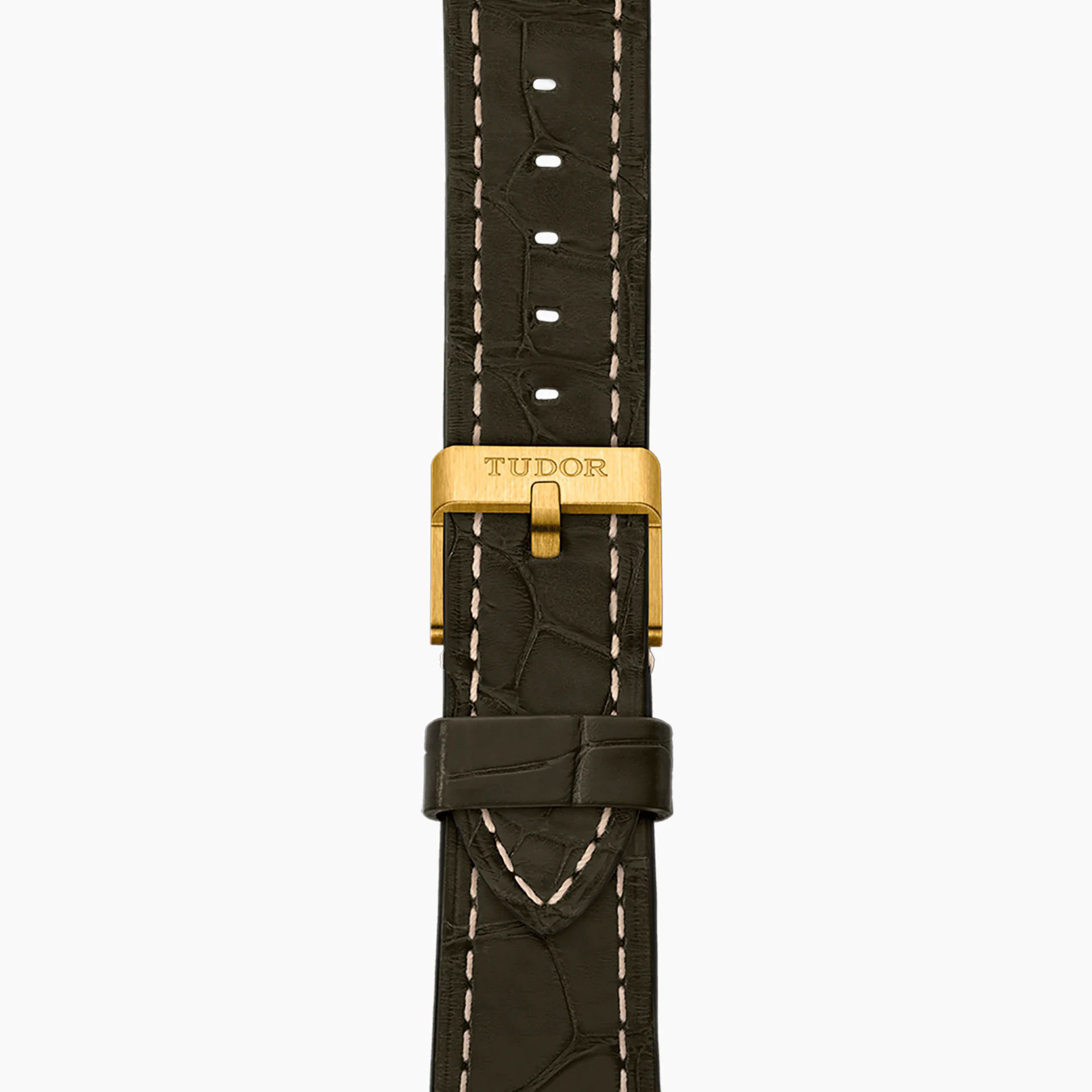 TUDOR Black Bay Fifty-Eight 18K Gelbgold - Manufakturwerk Kaliber MT5400 (COSC), Gehäuse in Gelbgold von 39 mm, Braunes Alligatorlederband, zusätzliches Textil-Armband. Satiniertes Gehäuse in 18 Karat Gelbgold, 39 mm. Transparenter Gehäuseboden aus Saphirglas. In eine Richtung drehbare Lünette in 18 Karat Gelbgold mit Zahlenscheibe aus mattgrün eloxiertem Aluminium, 60-Minuten-Graduierung und Ziffern in Gold. Gewölbtes dunkelbraunes Alligatorlederband mit Stiftschließe in 18 Karat GelbgoldProduktspezifikationen