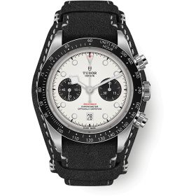 TUDOR Black Bay Chrono - Manufakturwerk Kaliber MT5813 (COSC) mit 70 h Gangreserve, Edelstahlgehäuse von 41 mm, Schwarzes Lederband. Feststehende Lünette in Edelstahl 316L mit Zahlenscheibe aus mattschwarz eloxiertem Aluminium, Tachymeterskalierung, Indizes in Silber. Zifferblatt Opalfarben mit mit schwarzen Totalisatoren, gewölbt. Datumsanzeige auf der 6-Uhr-Position. Schwarzes Lederband mit abnehmbarer Manschette mit Sicherheitsfaltschließe.Produktspezifikationen