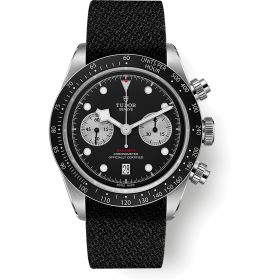 TUDOR Black Bay Chrono - Manufakturwerk Kaliber MT5813 (COSC) mit 70 h Gangreserve, Edelstahlgehäuse von 41 mm, Schwarzes Textilband. Feststehende Lünette in Edelstahl 316L mit Zahlenscheibe aus mattschwarz eloxiertem Aluminium, Tachymeterskalierung, Indizes in Silber. Zifferblatt Schwarz mit mit silbernen Totalisatoren, gewölbt. Datumsanzeige auf der 6-Uhr-Position. Schwarzes Textilband mit Dornschließe.Produktspezifikationen