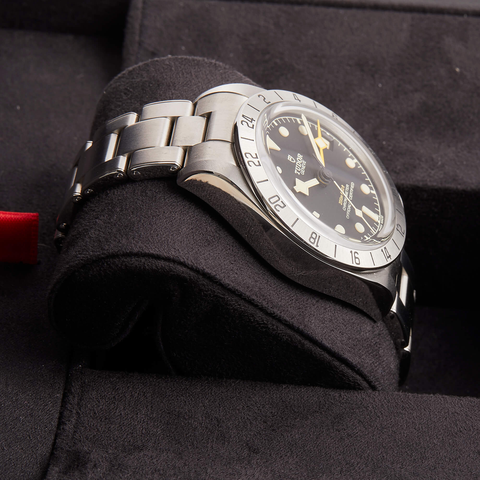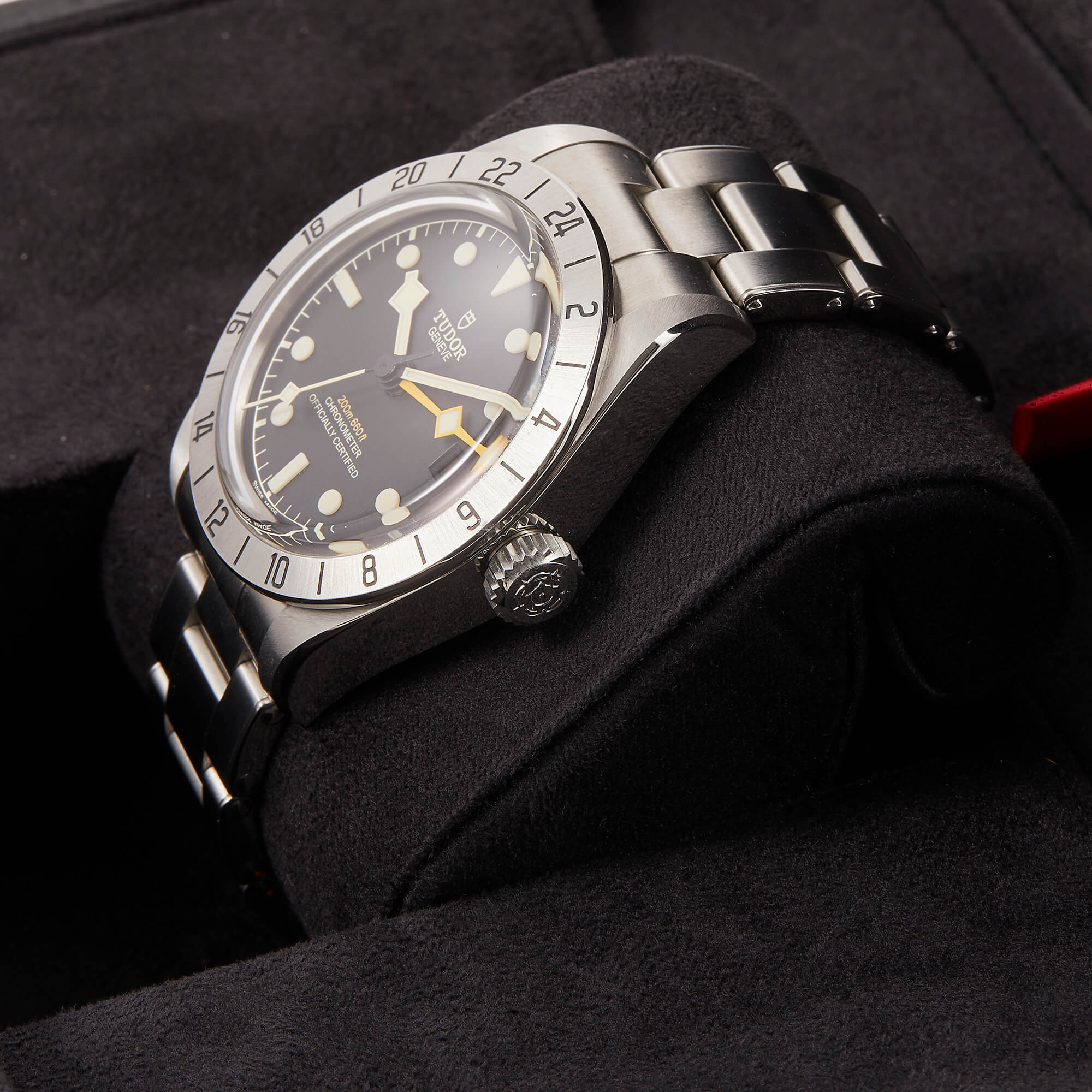 TUDOR Black Bay Pro – Edelstahlgehäuse mit 39 mm Durchmesser, Manufakturwerk Kaliber MT5652 (COSC) mit einer Gangreserve von ca. 70 Stunden. Verschraubbare Aufzugskrone in Edelstahl mit TUDOR Rose im Relief. Wasserdicht bis 200 Meter Tiefe (20 Bar). Feststehende Lünette mit 24‑Stunden-Graduierung in satiniertem Edelstahl. Schwarzes, gewölbtes Zifferblatt. Metallband mit Faltschließe.