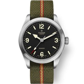 TUDOR Neuheit 2022: Die Tudor Ranger erscheint in einem Edelstahlgehäuse von 39 mm. Manufakturwerk Kaliber MT5402 (COSC) mit ca. 70 Stunden Gangreserve. Schwarzes Zifferblatt. Grünes Textilband mit roten und beigefarbenem Streifen und Stiftschließe.Produktspezifikationen