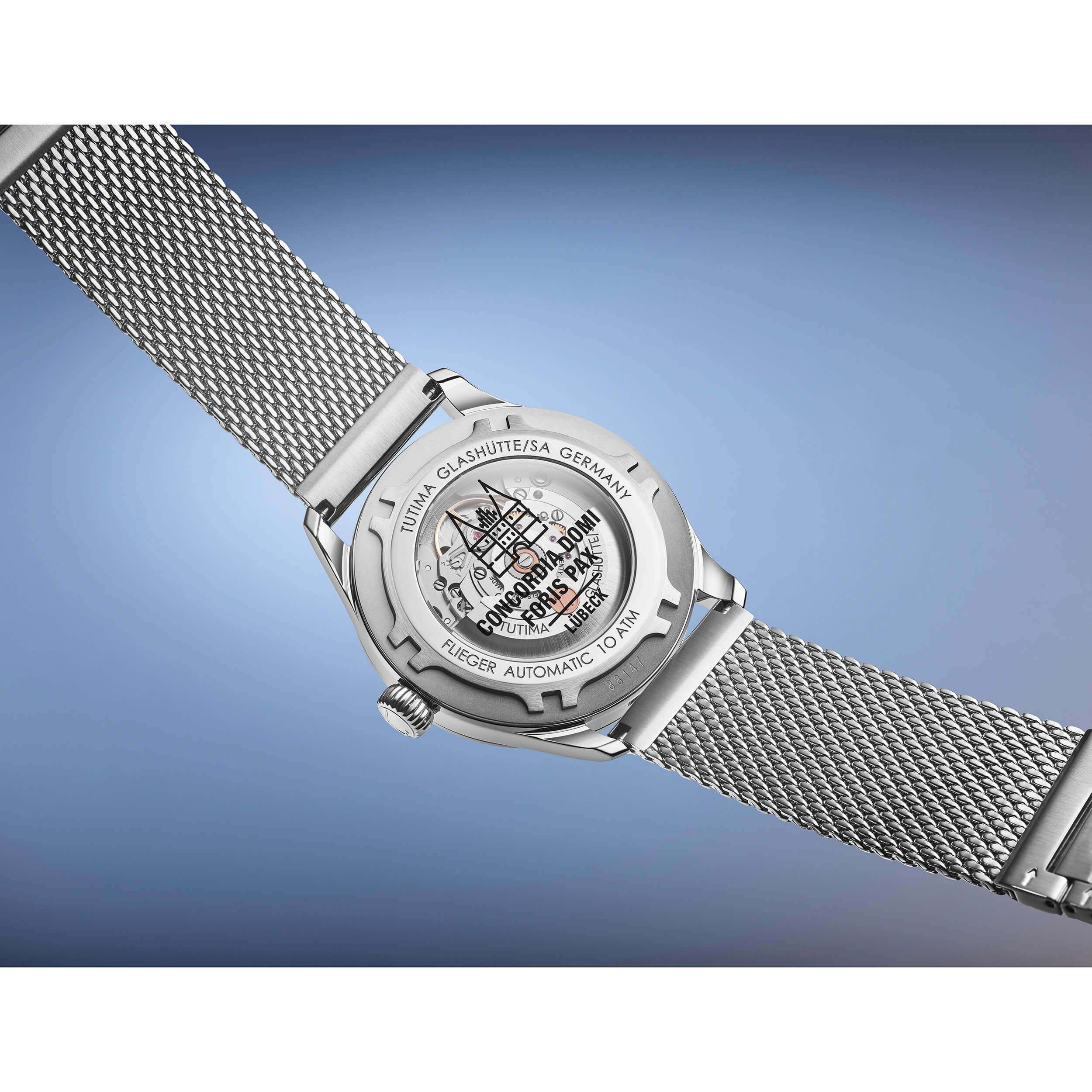 Die Tutima Sky Automatic „Holstentor Lübeck“ (Ref. 6105-98) ist eine auf 100 Exemplare limitierte Edition, die das klassische Design der Sky Automatic mit einem besonderen Lübecker Detail verbindet. Auf dem Glasboden ist das Holstentor-Logo samt Schriftzug „Concordia Domi Foris Pax – Lübeck“ eingraviert, was so viel bedeutet wie Harmonie im Inland, Frieden im Ausland. Das 41 mm große Edelstahlgehäuse mit Milanaiseband schützt das elegante blaue Dégradé-Zifferblatt, während das Tutima Kaliber 330 Automatikwerk mit 25 Steinen, rhodiniertem Rotor und Goldsiegel für präzise Zeitmessung sorgt. Die Uhr bietet Stunden-, Minuten- und Zentralsekundenanzeige sowie eine Datumsfunktion. Mit einer Gangreserve von 38 Stunden, 10 atm Wasserdichtigkeit, bombiertem entspiegeltem Saphirglas sowie verschraubter Krone und Sichtboden vereint sie Robustheit, Funktionalität und elegantes Design zu einem exklusiven Sammlerstück für Liebhaber feiner Fliegeruhren.Produktspezifikationen