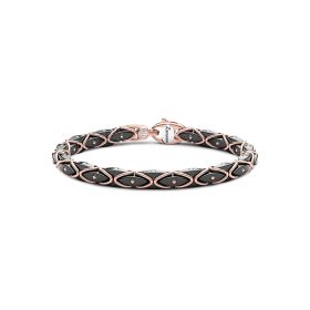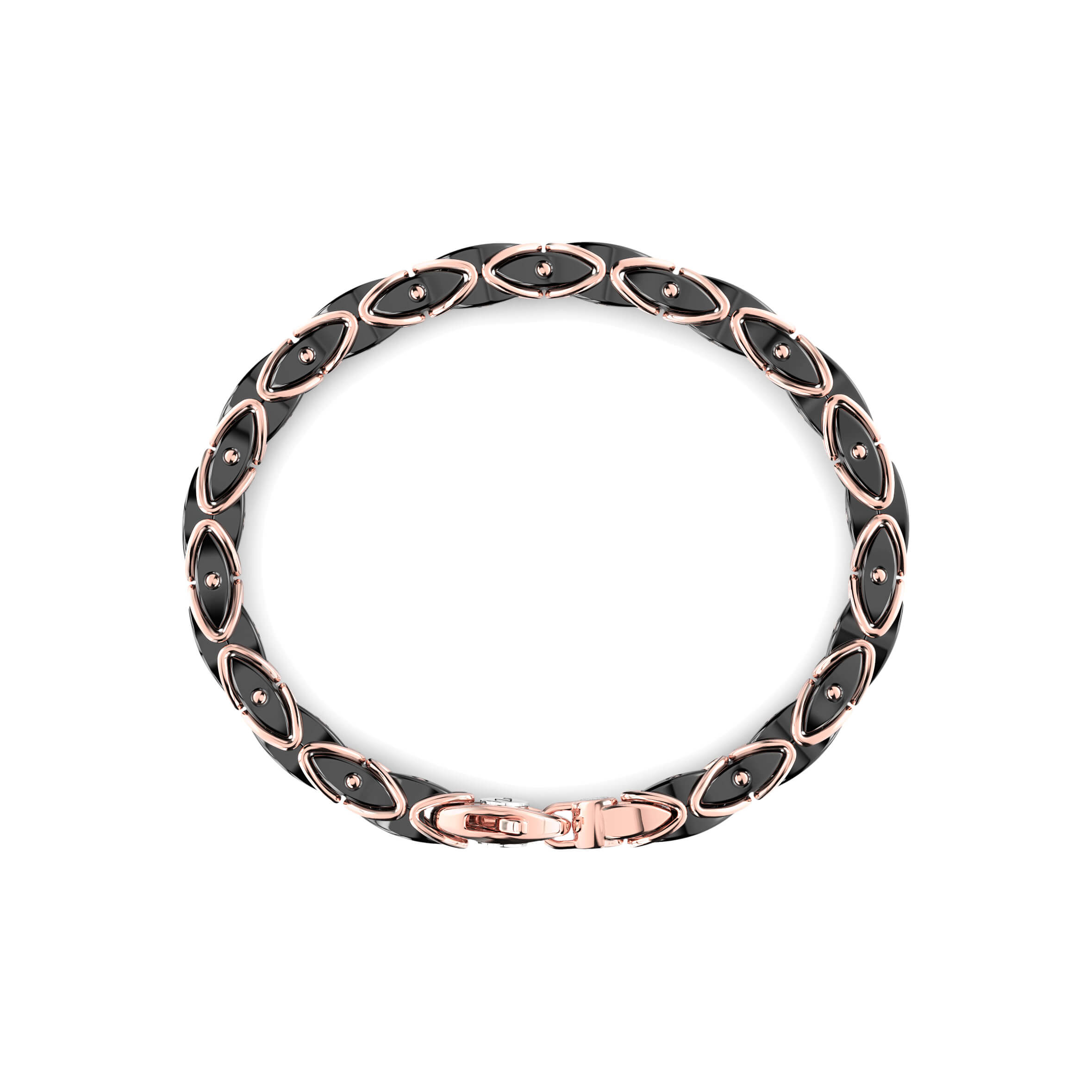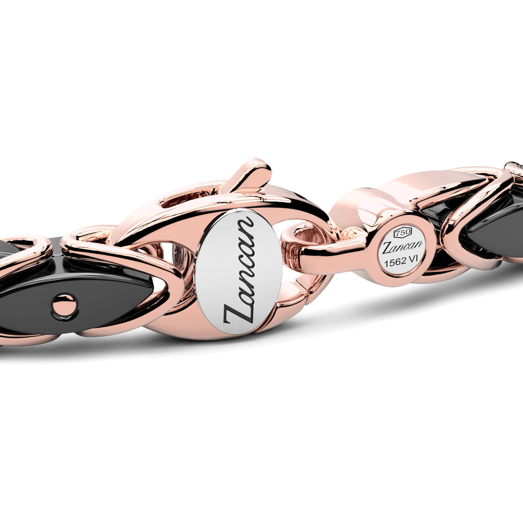 Armband von Zancan aus 750/- Rotgold und schwarzer Keramik. Das Armband besteht aus geometrischen Gliedern, verbunden durch kleine Schrauben, die dem Schmuckstück ein geometrisch-mechanisches Design verleihen. Der Kontrast zwischen dem Rotgold und der glänzenden schwarzen Keramik verleiht dem Armband eine starke visuelle Wirkung. Ein mechanisches Meisterwerk, das dieses hochwertige Schmuckstück perfekt in Szene setzt. Das Armband ist Teil der Kollektion Ceramikgold, einer Kollektion, die 750/- Gold und Keramik durch raffinierte Verarbeitungstechniken miteinander verbindet. Das Armband wird vollständig in Italien handgefertigt.Produktspezifikationen
