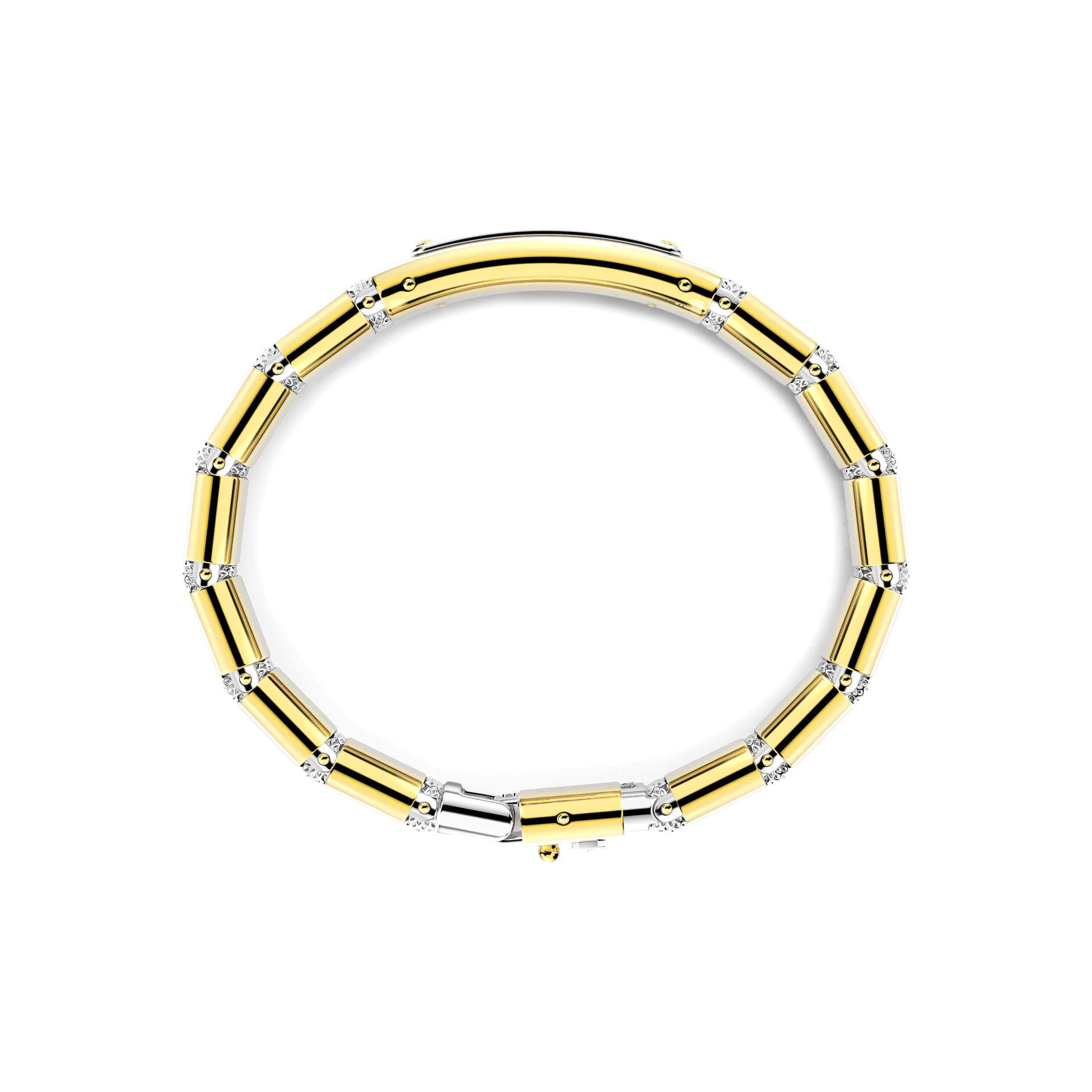 Armband von Zancan aus 750/- Gelb- und Weißgold mit schwarzen Diamanten. Das Armband besteht aus Gliedern aus Gelb- und Weißgold, die mechanisch und technisch zusammengefügt werden. Der Kontrast zwischen Gelb- und Weißgold verleiht diesem Armband eine starke visuelle Wirkung. Es ist ein Juwel von großer mechanischer Komplexität.Produktspezifikationen