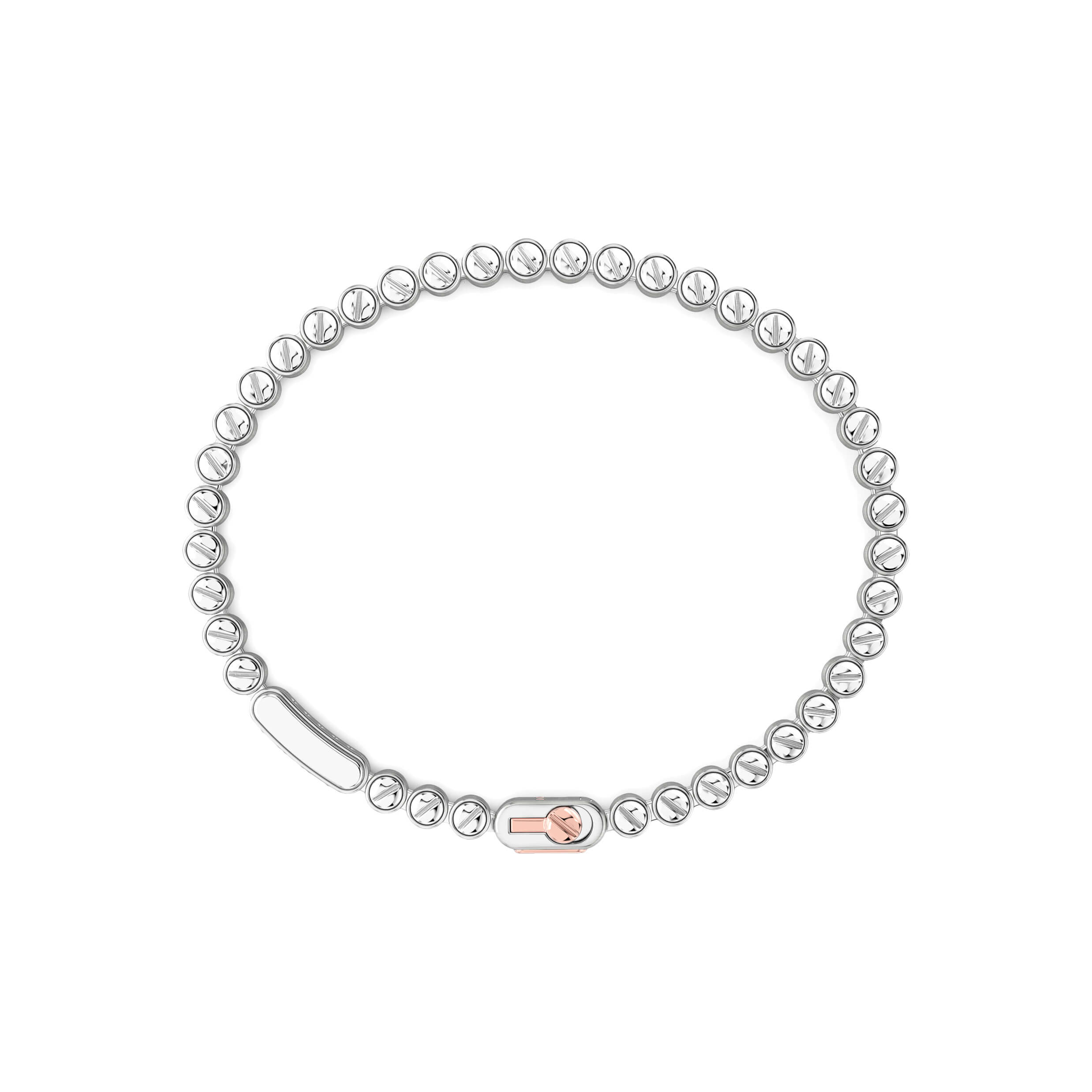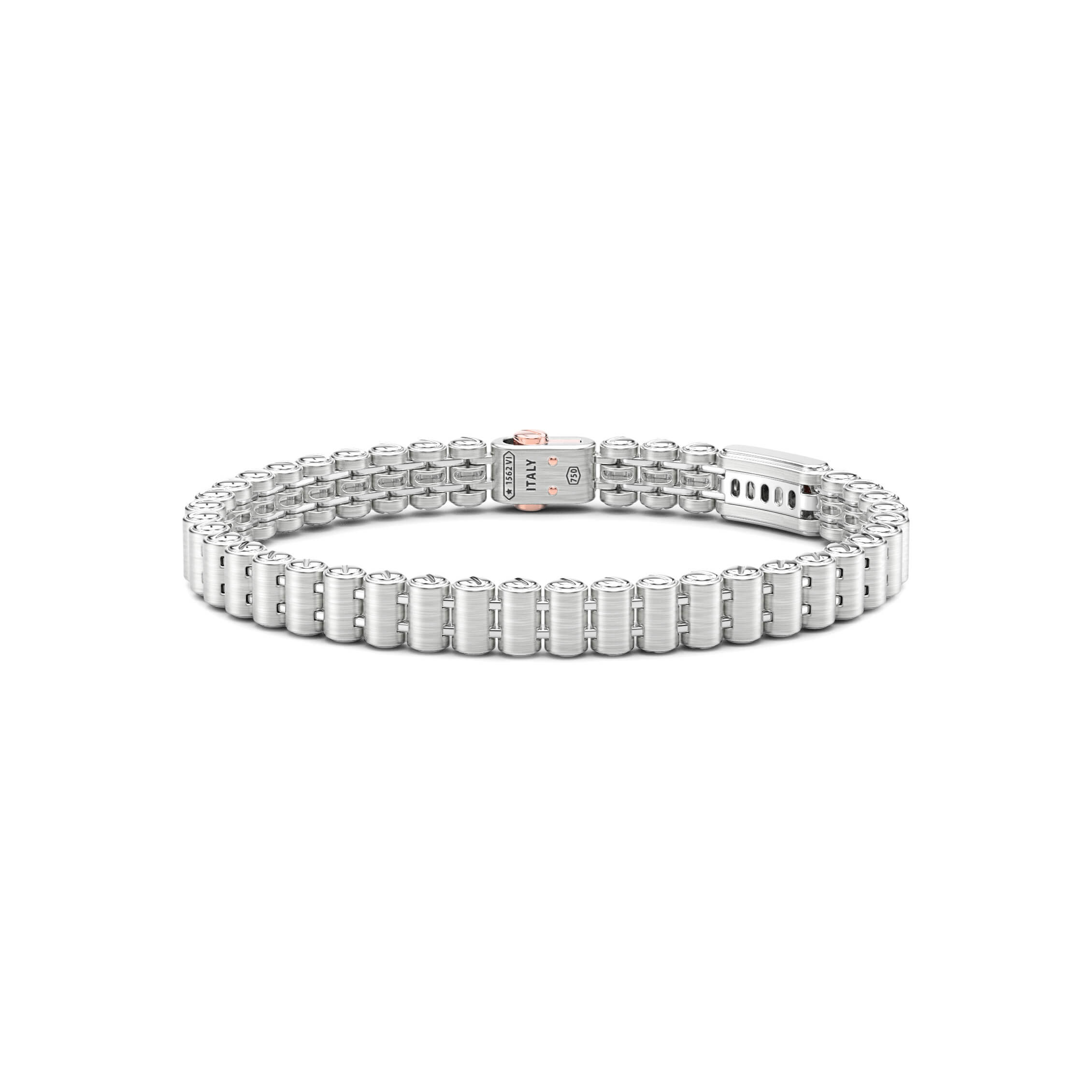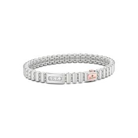 Armband von Zancan aus 750/- Weiß- und Rotgold mit weißen Diamanten. Das Armband besteht aus Weiß- und Rotgoldgliedern, die mechanisch und technisch zusammengefügt werden. Der Kontrast zwischen Rosé- und Weißgold verleiht diesem Armband eine starke visuelle Wirkung. Es ist ein Juwel von großer mechanischer Komplexität.Produktspezifikationen