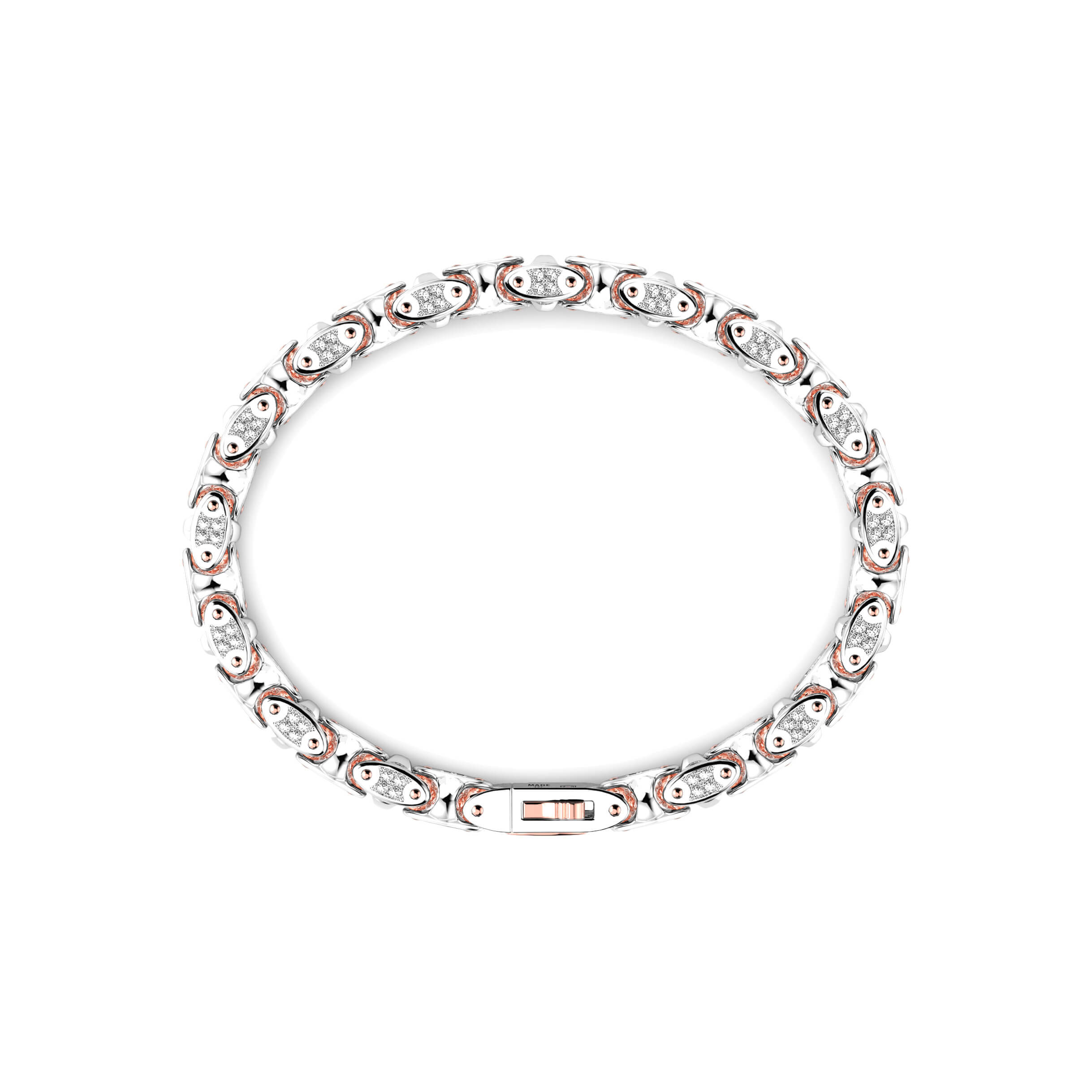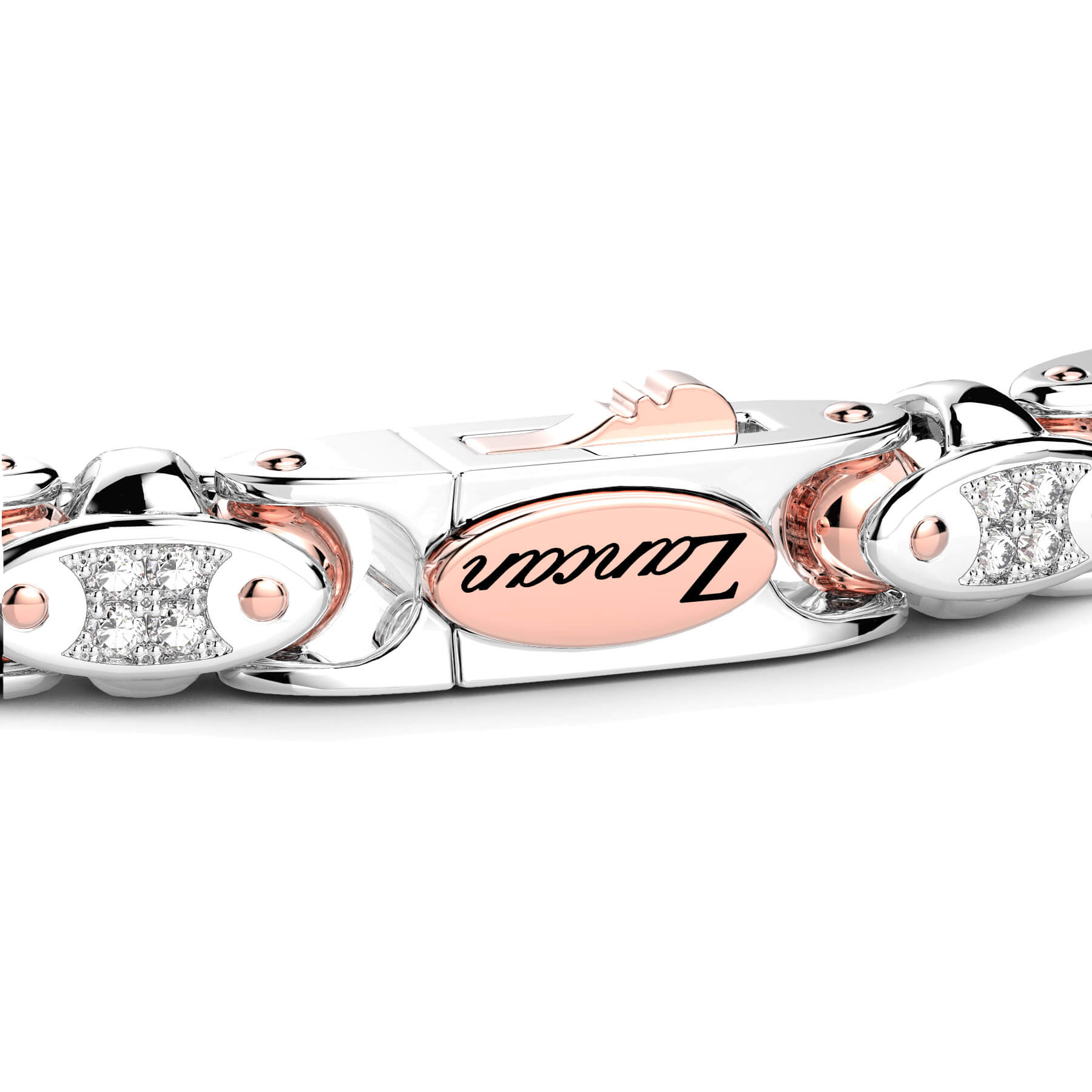 Armband von Zancan aus 750/- Weiß- und Rotgold mit weißen Diamanten. Das Armband besteht aus Weiß- und Rotgoldgliedern, die mechanisch und technisch zusammengefügt werden. Der Kontrast zwischen Rosé- und Weißgold verleiht diesem Armband eine starke visuelle Wirkung. Es ist ein Juwel von großer mechanischer Komplexität.Produktspezifikationen