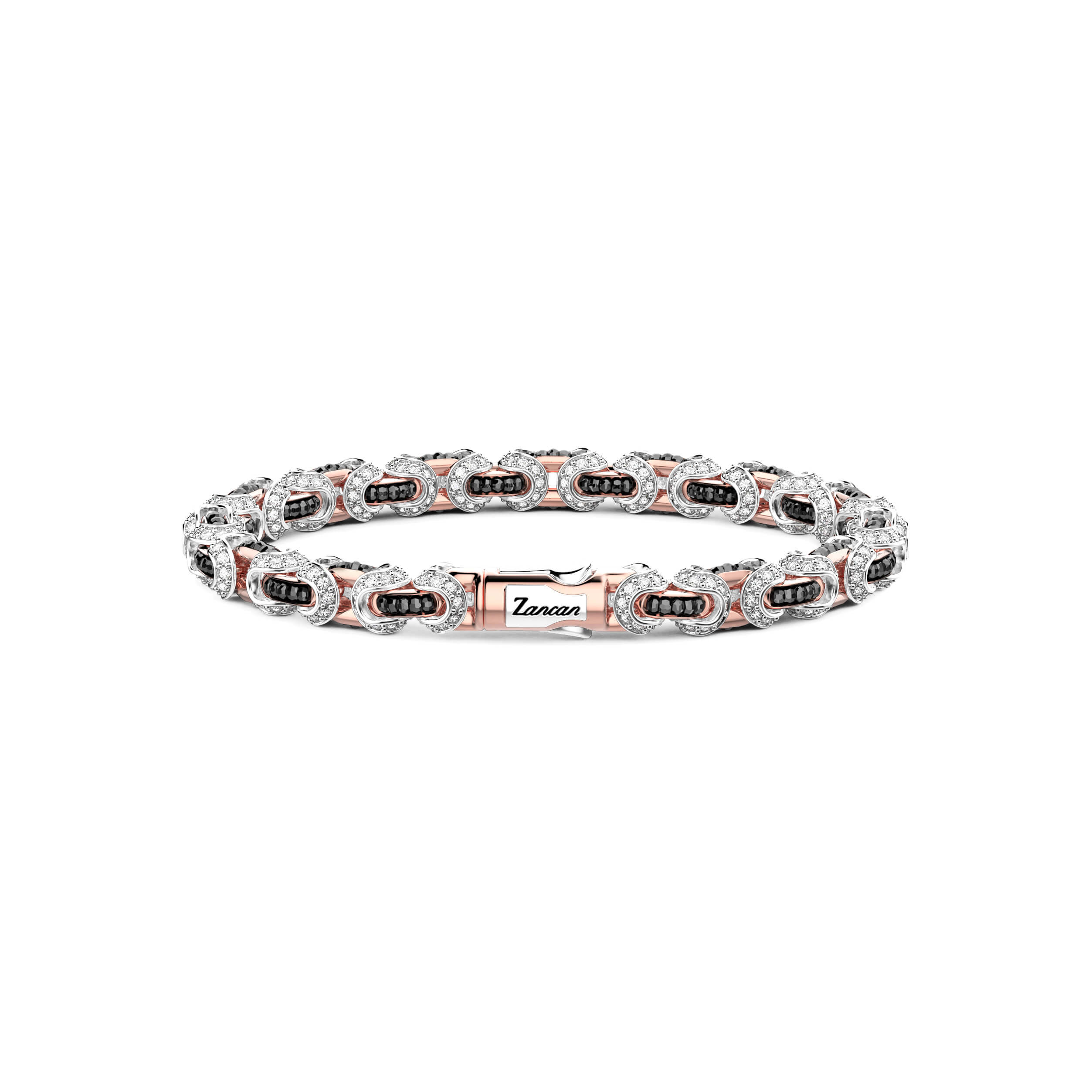 Armband von Zancan aus 750/- Weiß- und Rotgold. Das Armband besteht aus Rosé- und Weißgoldgliedern, die mechanisch und technisch zusammengefügt werden. Der Kontrast zwischen Rosé- und Weißgold verleiht diesem Armband eine starke visuelle Wirkung. Es ist ein Juwel von großer mechanischer Komplexität.Produktspezifikationen