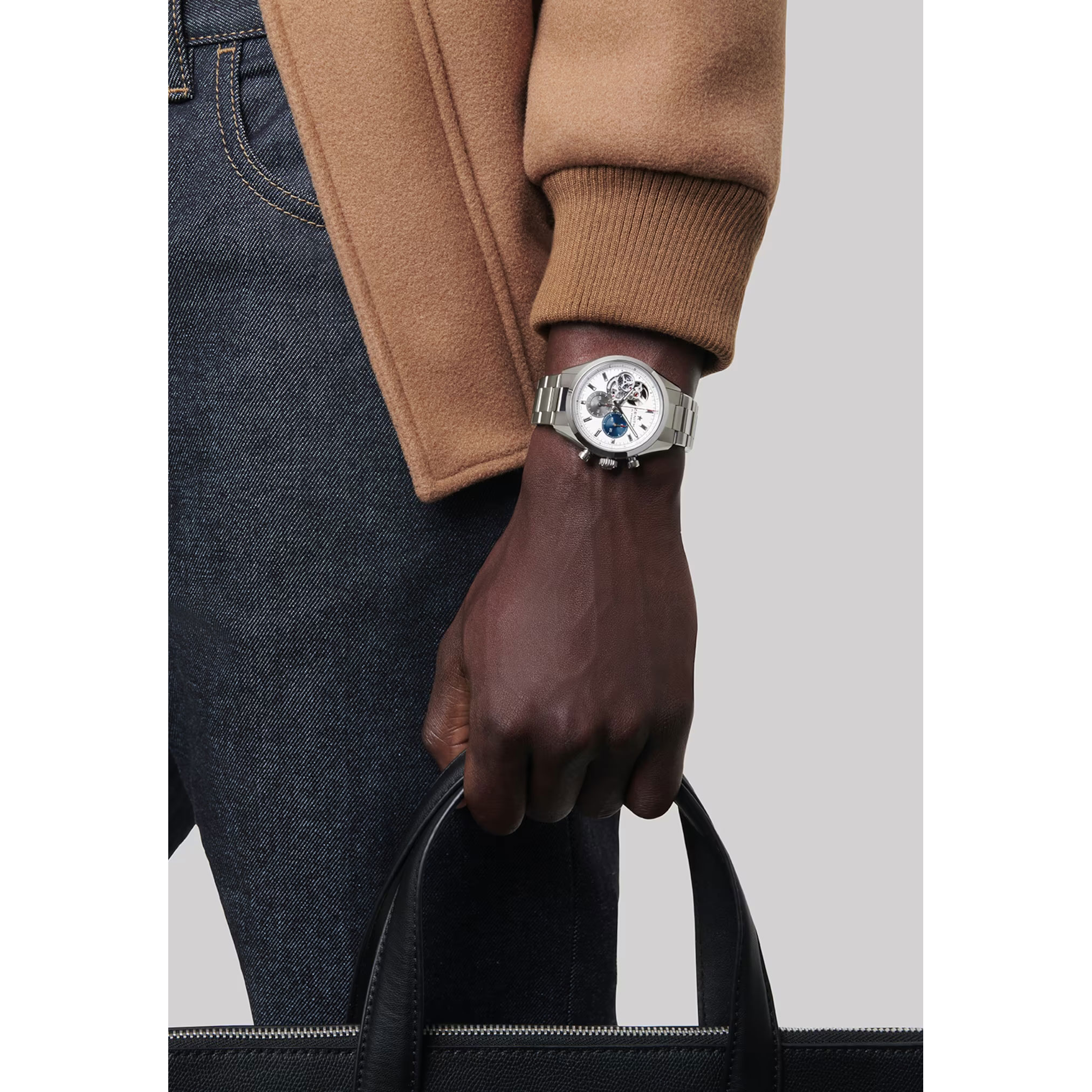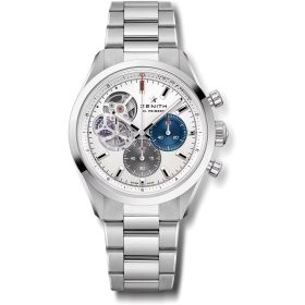 Die Chronomaster Open bietet über das Zifferblatt einen Blick auf das schlagende Herz des Uhrwerks El Primero. Diese Version mit schlankem 39,5-mm-Edelstahlgehäuse verfügt über ein mattsilbernes Zifferblatt mit dreifarbigen Zählern und einem transparenten Zähler für die laufende Sekunde und ein integriertes Edelstahlarmband. Angetrieben vom automatischen 1/10-Sekunden-Chronographenwerk El Primero 3604.Produktspezifikationen