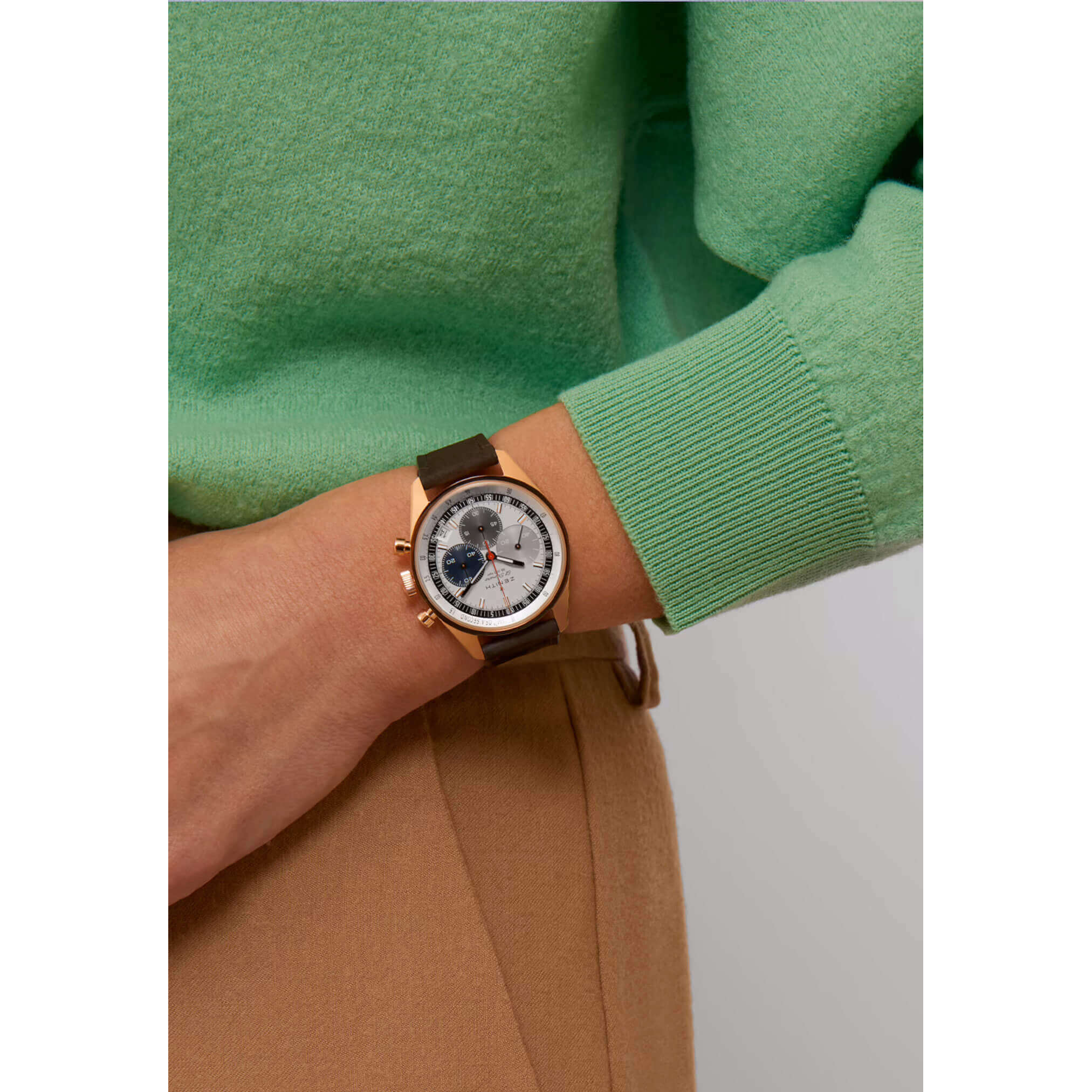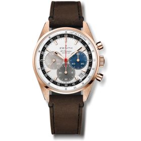 Die Zenith Chronomaster Original besticht durch ein 38 mm großes Gehäuse aus 18 Karat Roségold mit denselben Proportionen wie die A386 in Verbindung mit dem legendären dreifarbigen Zifferblatt und einem braunen Lederarmband. Angetrieben von dem automatischen Hochfrequenzchronographenwerk El Primero 3600 mit 1/10-Sekunden-Chronographenfunktion und einer Gangreserve von 60 Stunden.Produktspezifikationen