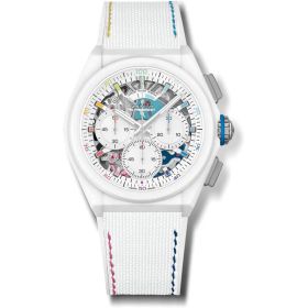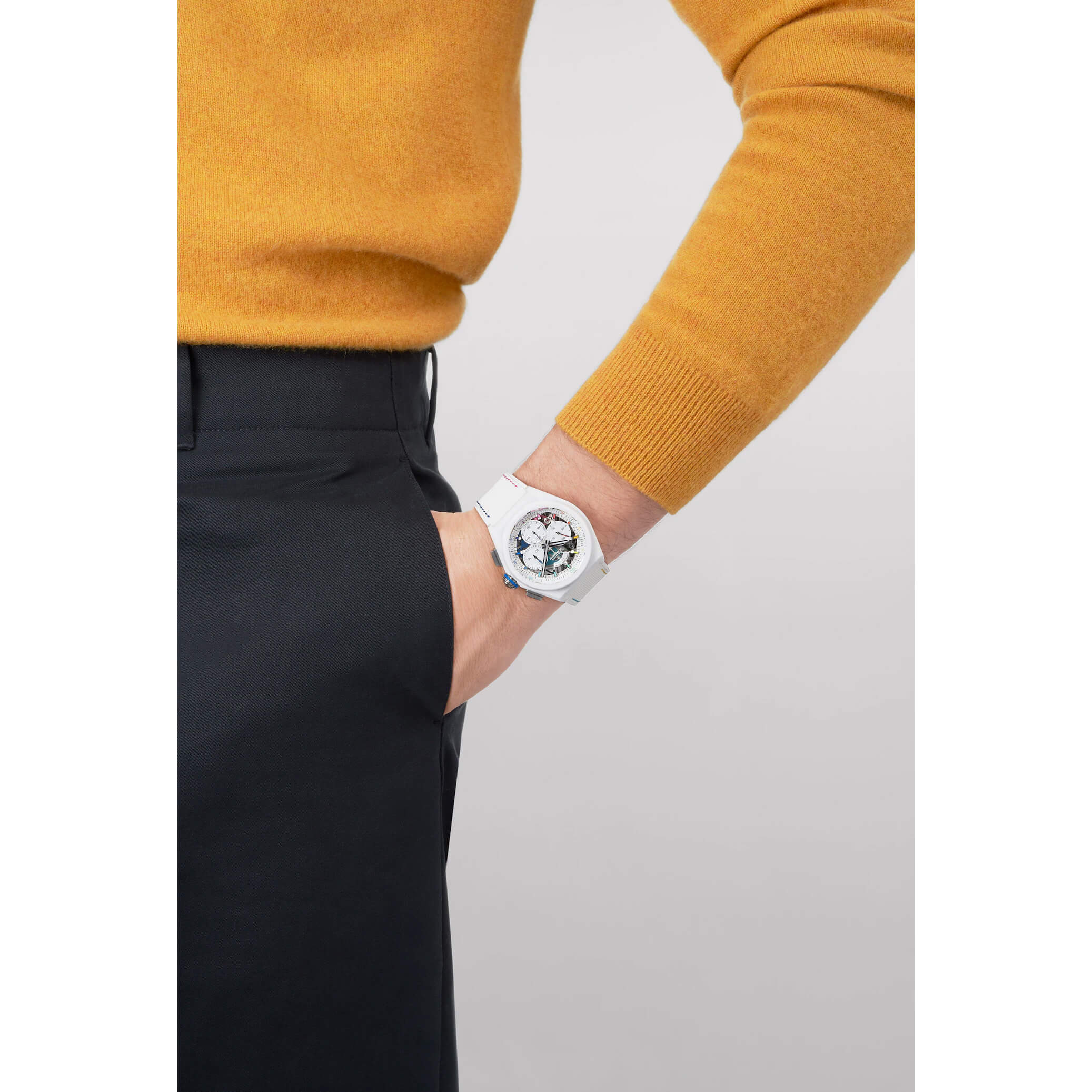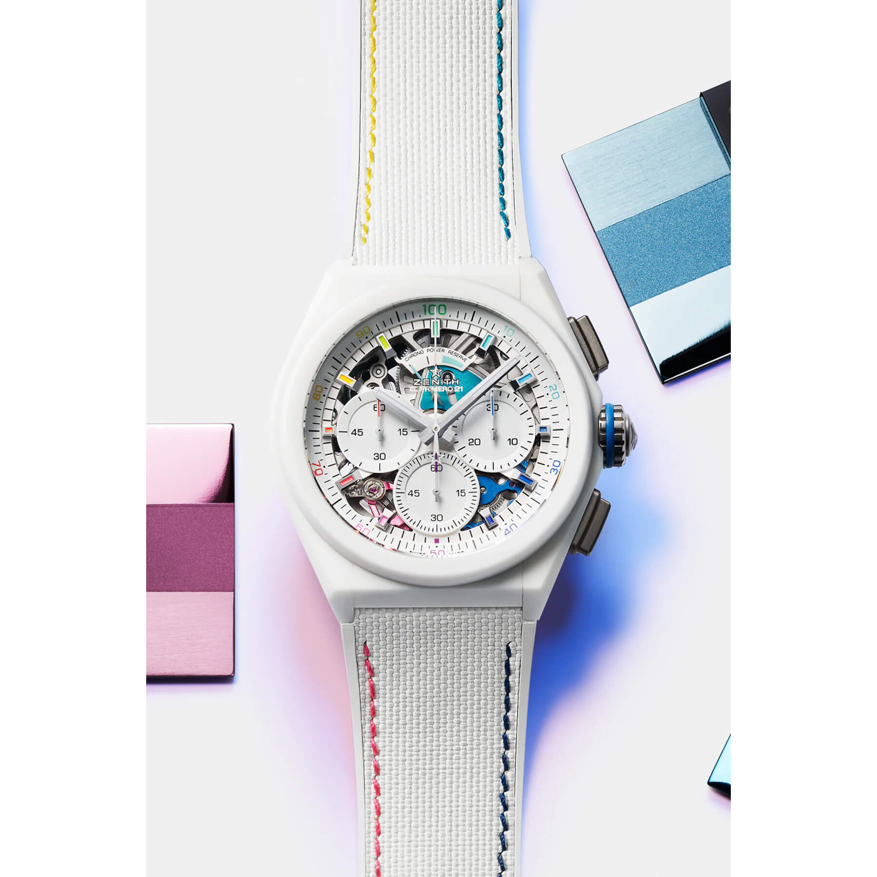 Die DEFY 21 Chroma II präsentiert eine lebendige Interpretation des 1/100-Sekunden-Hochfrequenzchronographen El Primero 21. Sie verfügt über ein eindrucksvolles mattweißes 44-mm-Keramikgehäuse, welches durch das offene Zifferblatt mit Indizes im atemberaubenden Regenbogenfarbverlauf einen faszinierenden Blick auf das Uhrwerk ermöglicht. Ein Hauch von Magie zeigt sich in den regenbogenfarbenen Nähten, die das weiße Kautschukarmband zieren. Diese beeindruckende Uhr ist auf 500 Exemplare limitiert.Produktspezifikationen