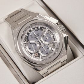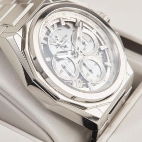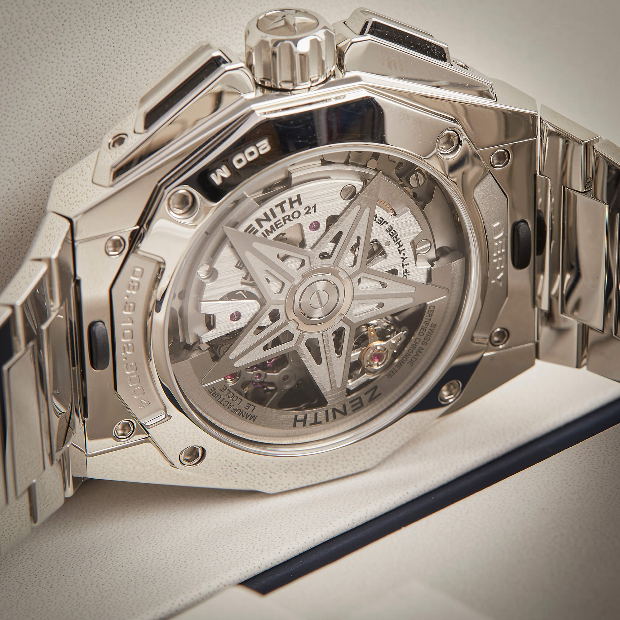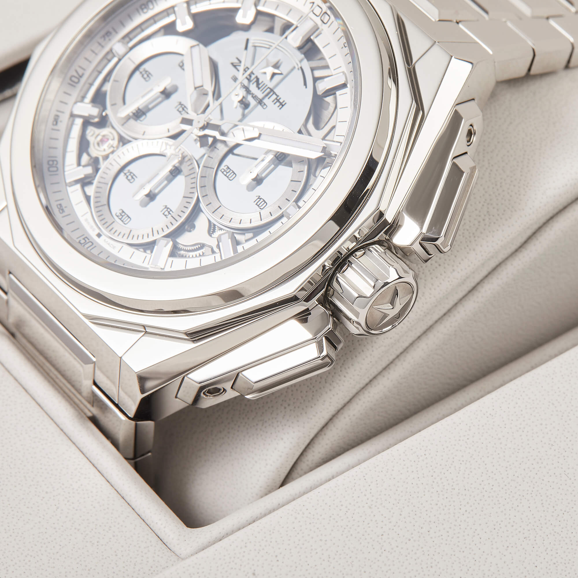 Der DEFY Extreme Mirror 1/100-Sekunden-Chronograph präsentiert sich mit einem futuristischen, hochreflektierenden Camouflage-Look, der mit Licht und Umgebung verschmilzt. Das vollständig hochglanzpolierte Edelstahlgehäuse verstärkt diesen eindrucksvollen Spiegel-Effekt. Durch das Saphirglaszifferblatt mit applizierten Totalisatoren eröffnet sich der Blick auf das automatische Hochfrequenzwerk El Primero 21 mit zwei unabhängigen Hemmungen, die mit 50 Hz beziehungsweise 5 Hz schlagen. Zum Lieferumfang gehören ein Edelstahlband, ein schwarzes Kautschukband sowie ein Velcro-Armband – für maximale Vielseitigkeit.