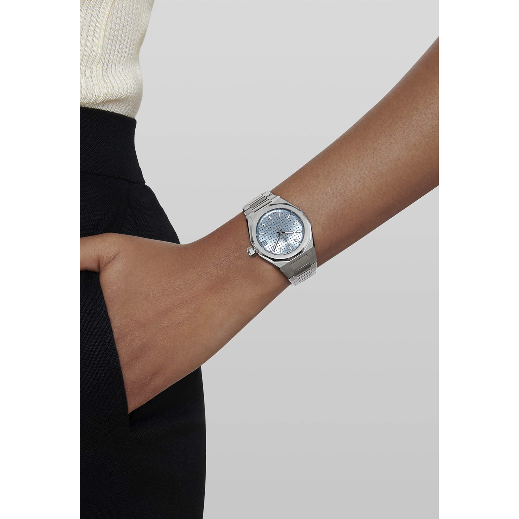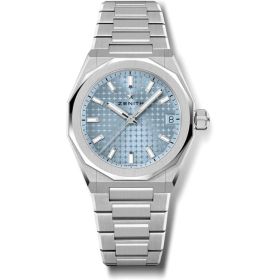 Die DEFY Skyline Boutique Edition in einem achteckigen 36-mm-Gehäuse aus Edelstahl mit einer faszinierenden facettierten Lünette. Ihr Zifferblatt mit Sonnenschliff erstrahlt in einem bezaubernden Metallic-Eisblau und interpretiert dabei den symbolträchtigen vierzackigen ZENITH Stern auf eine neue Art und Weise. Das automatische Manufakturwerk Elite 670 treibt diese bemerkenswerte Uhr an und gewährleistet präzise Zeitmessung. Das Armband der Uhr ist aus Edelstahl gefertigt. Zusätzlich wird ein eisblaues, gemustertes Kautschukarmband angeboten. Beide Armbänder können problemlos ausgetauscht werden, da die Uhr über ein ausgereiftes Auswechselsystem verfügt.