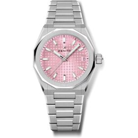 Die DEFY Skyline im achteckigen 36-mm-Edelstahlgehäuse mit facettierter Lünette und einem Zifferblatt mit Sonnenschliff in Metallic-Pastellrosa, das den emblematischen vierzackigen Stern von ZENITH aufgreift. Angetrieben von dem automatischen Manufakturwerk Elite 670. Austauschbares Armband aus Edelstahl und Kautschukarmband mit rosa Muster.