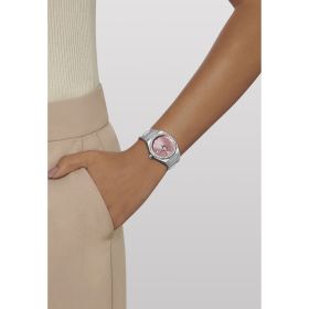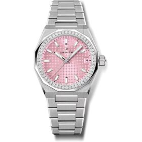 Die DEFY Skyline im achteckigen 36-mm-Edelstahlgehäuse mit diamantbesetzter facettierter Lünette und einem Zifferblatt mit Sonnenschliff in Metallic-Pastellrosa, das den emblematischen vierzackigen Stern von ZENITH aufgreift. Angetrieben von dem automatischen Manufakturwerk Elite 670. Austauschbares Armband aus Edelstahl und Kautschukarmband mit rosa Muster.