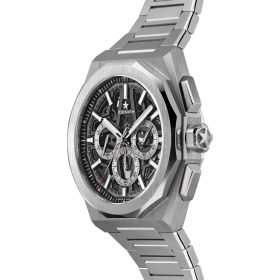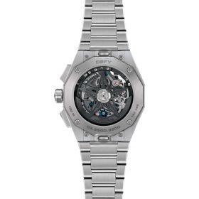Die DEFY Skyline Chronograph Skeleton präsentiert sich in einem achteckigen 42-mm-Gehäuse aus Edelstahl mit markant facettierter Lünette. Das offen gestaltete schwarze Zifferblatt mit silberfarbenen Totalisatoren sorgt für einen ausdrucksstarken Kontrast. Im Inneren arbeitet das skelettierte Manufakturkaliber El Primero 3600SK – ein automatischer Hochfrequenz-Chronograph mit präziser 1/10-Sekunden-Anzeige. Zum Lieferumfang gehören sowohl ein Edelstahlarmband als auch ein Kautschukarmband mit schwarzem Muster, die sich dank des innovativen Schnellwechselsystems unkompliziert austauschen lassen.Produktspezifikationen